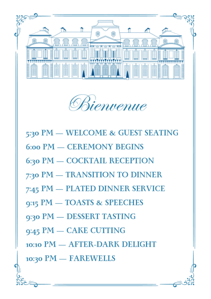 After the main courses there will be a dedicated time for speeches. The dinner service will conclude with an assortment of desserts. If you would like to give a speech, please send a written copy ahead of time to contact@tianaandandrews.com by 6/25/2025.